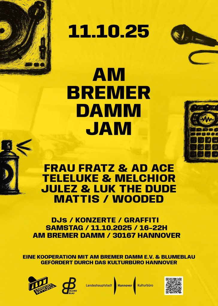 Save the date! AM BREMER DAMM JAM 11.10.25 in Hannover. Graffiti, DJs & Konzerte. Mit Julez, Luk The Dude, Ad Ace, Frau Fratz, Teleluke, Melchior, Mattis & wooded. Eintritt Frei.